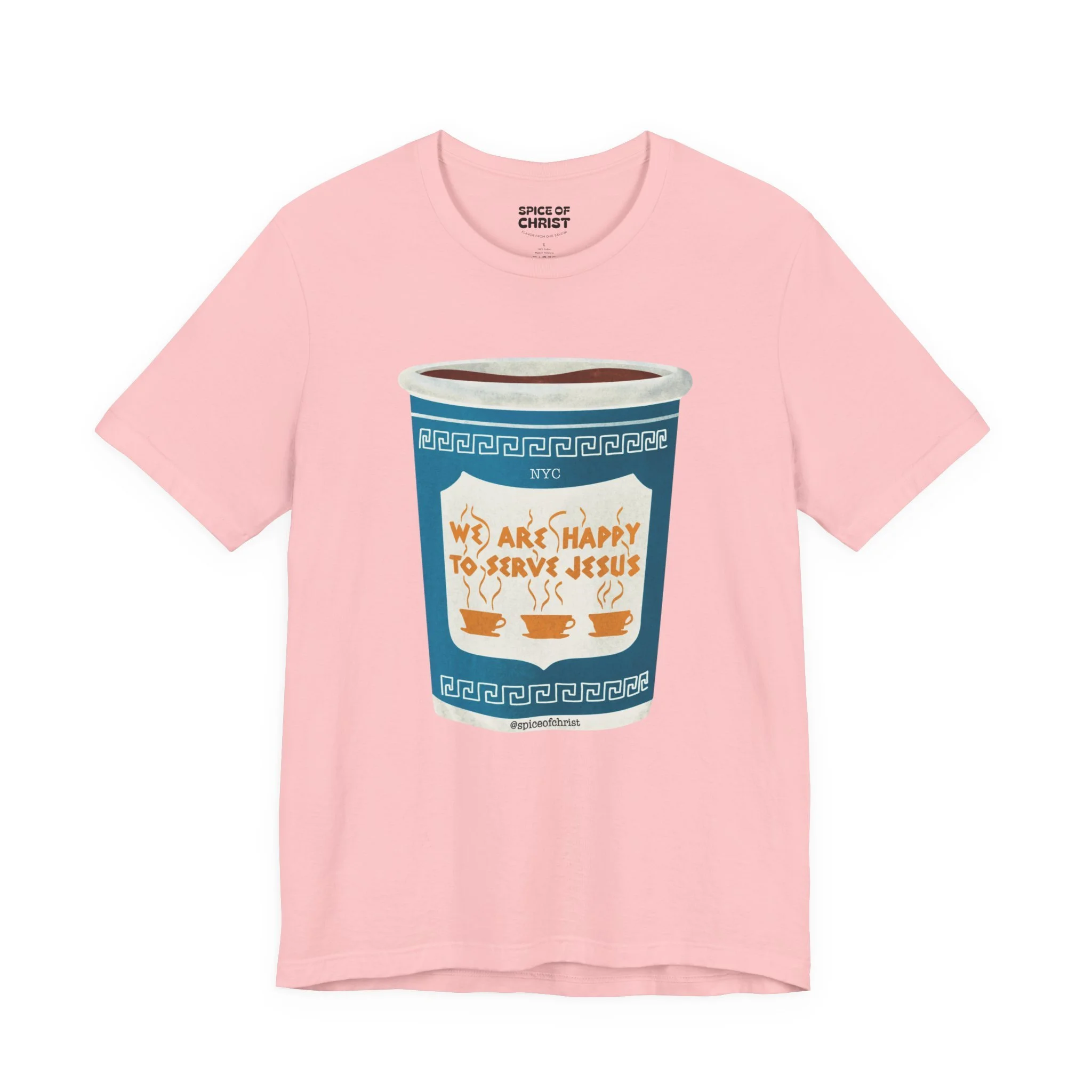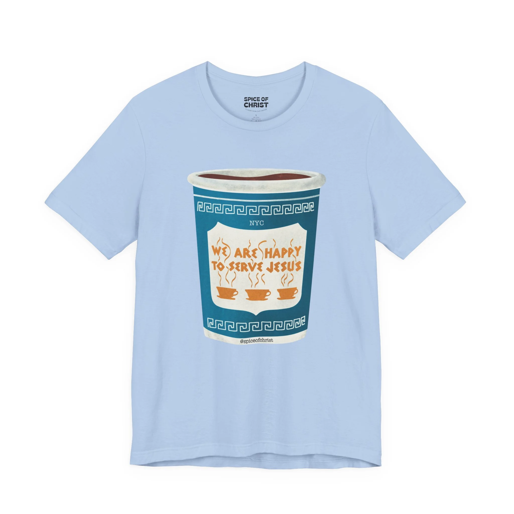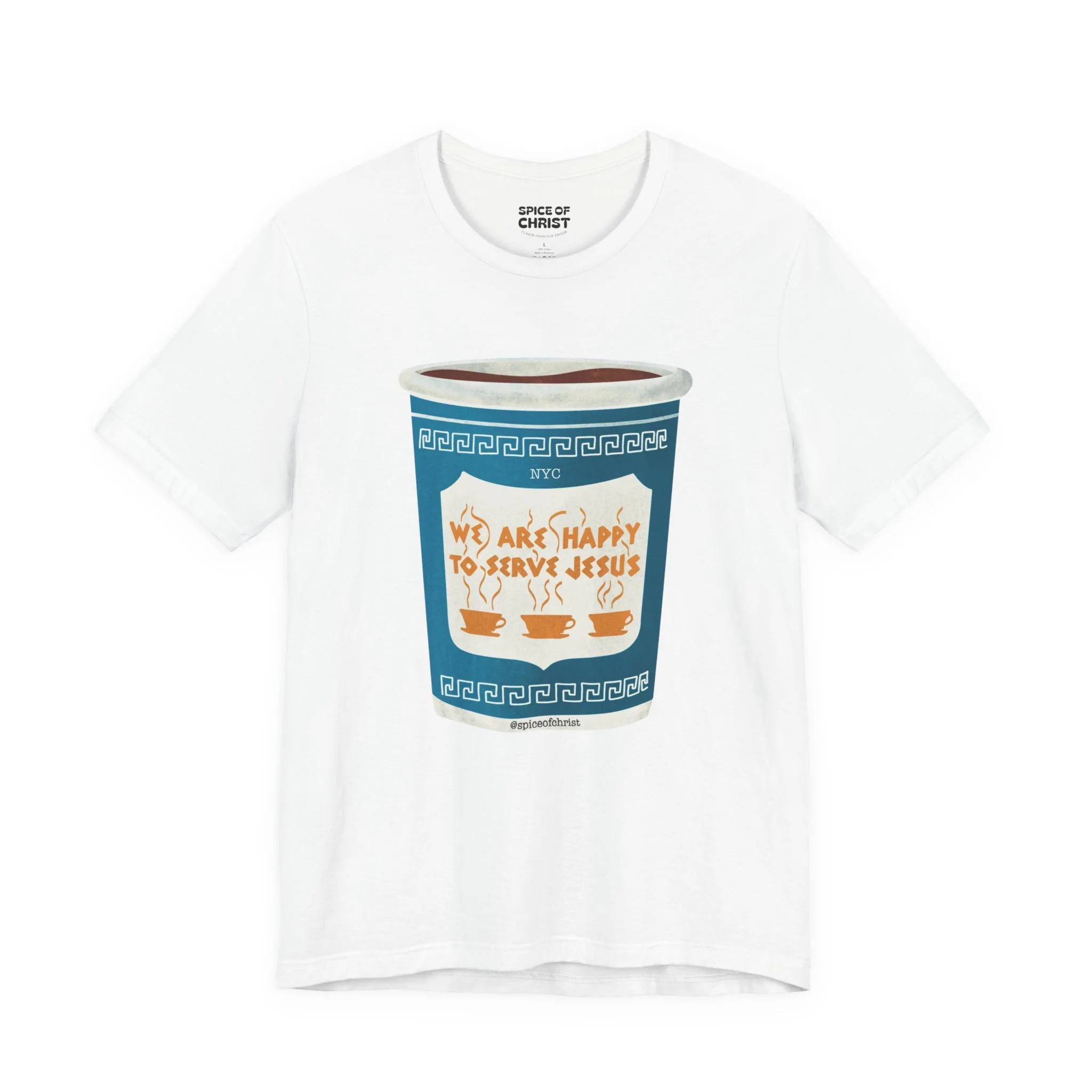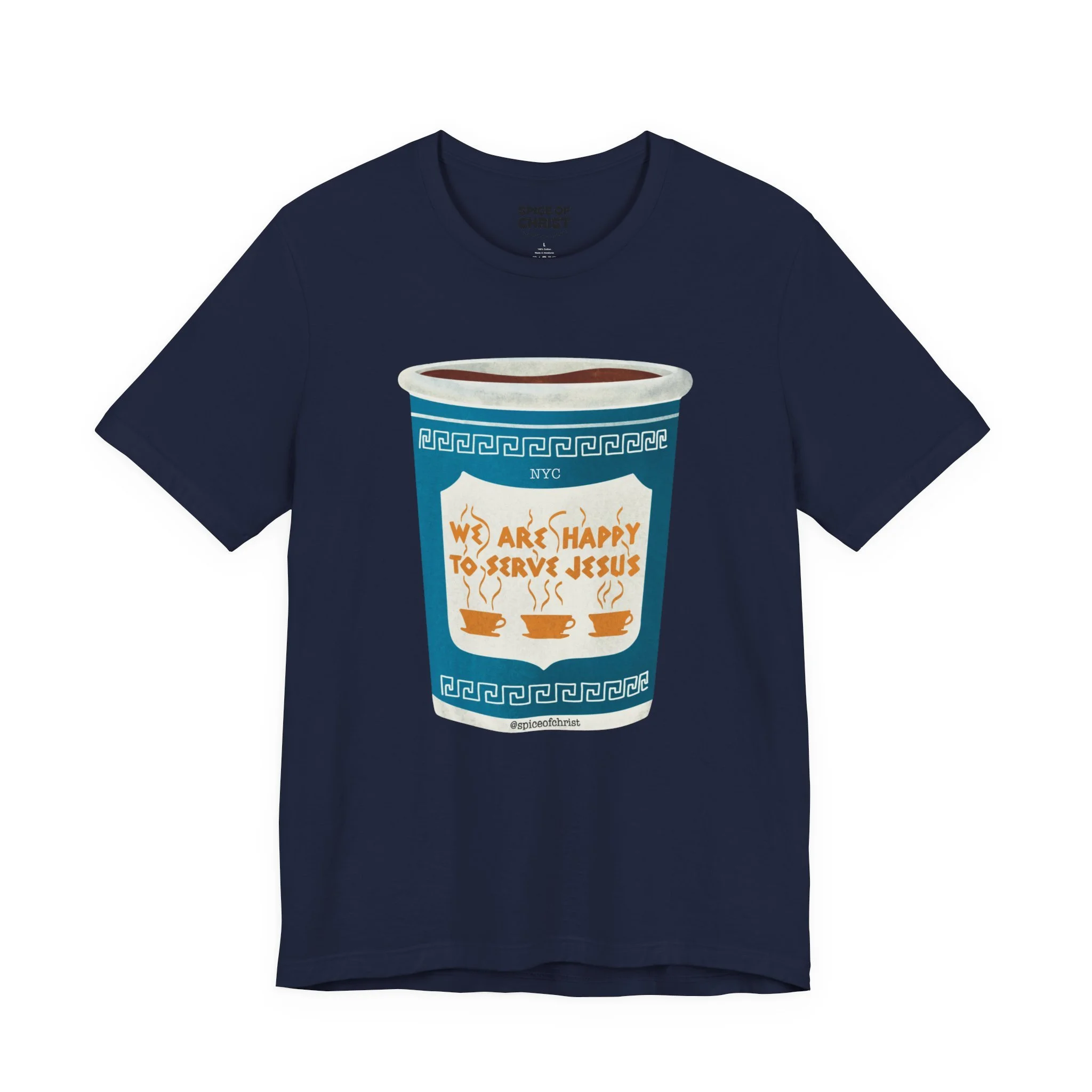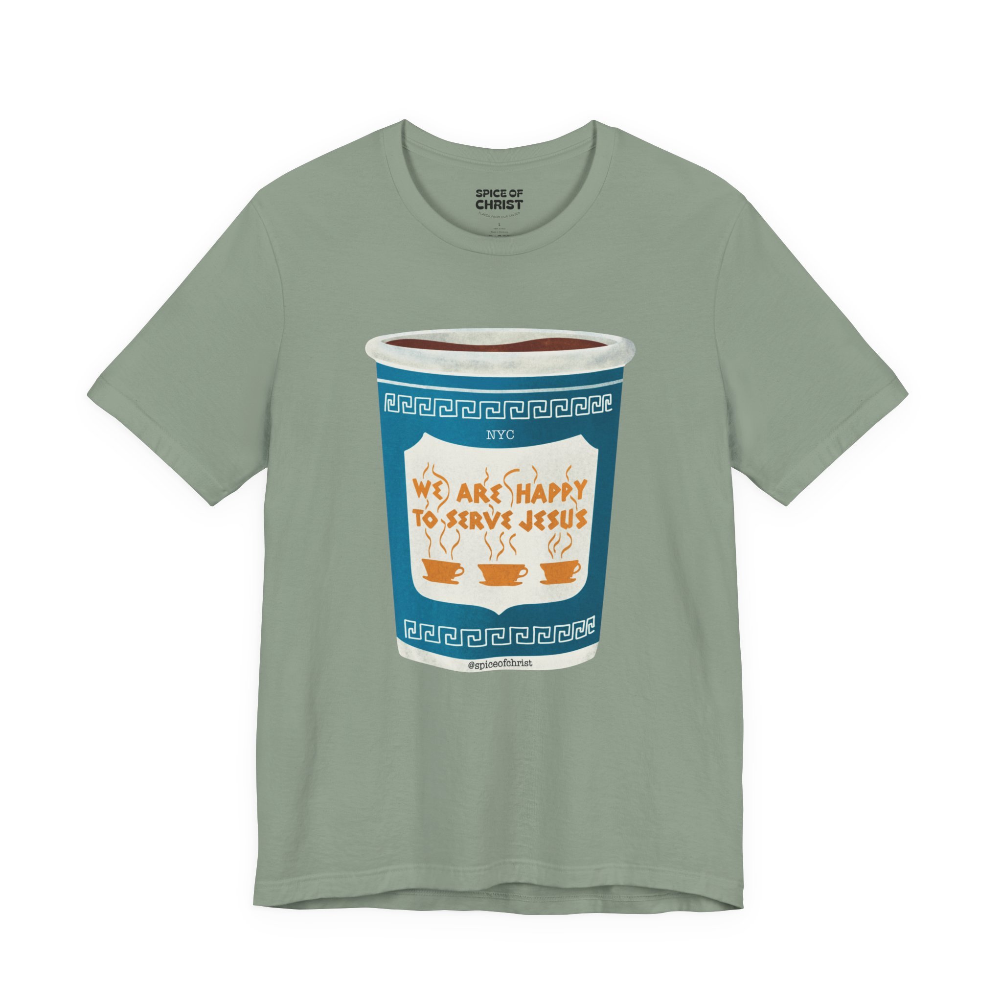 Inspired by the iconic New York City greek coffee cup “We Are Happy to Serve You” but with a Twist "We are happy to serve Jesus." This design is a bold reminder of who we truly serve — Jesus.