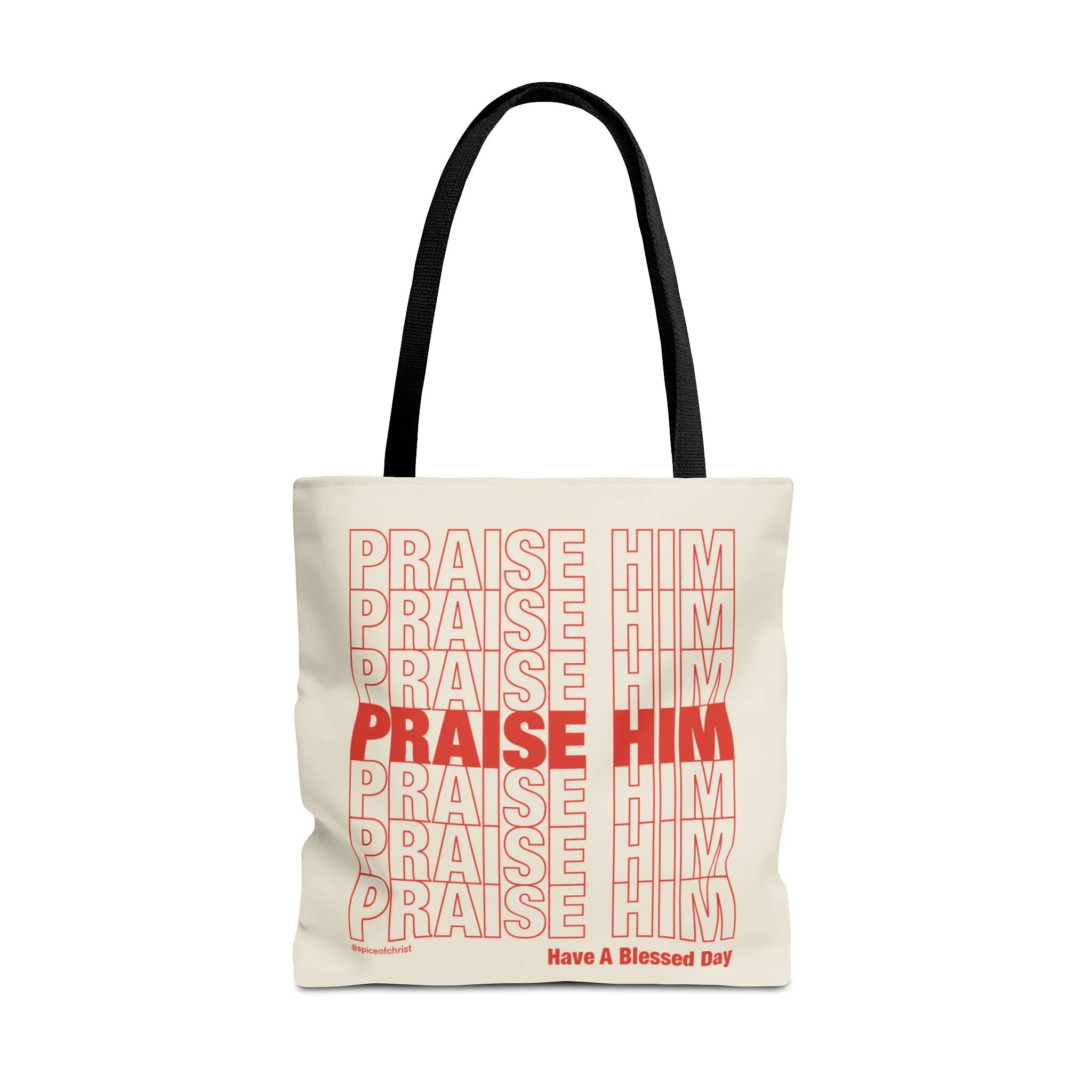 Shop All › PRAISE HIM (red text) - Tote Bag 16"x16" Image 1 of 2 Image 2 of 2 PRAISE HIM (red text) - Tote Bag 16"x16" $26.00 design available as a: T-shirt, print, & sticker Add To Cart Added! design available as a: T-shirt, print, & sticker